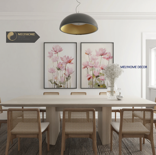 Treo tranh có tông ấm nhẹ như cam đất, hồng pastel, đỏ đô, giúp không gian thêm gần gũi, kích thích cảm giác ngon miệng và duy trì năng lượng tích cực trong gia đình.